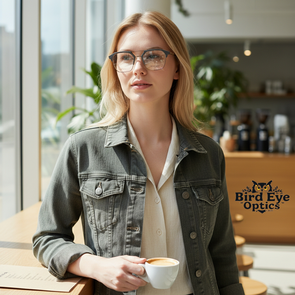 Bird Eye Optics Tip: > These frames look best on Oval, Round, and Heart-shaped faces, as the geometric angles provide a great contrast to softer facial features.