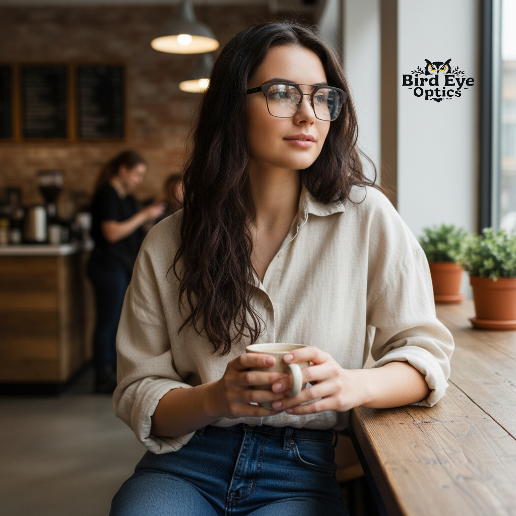 Bird Eye Optics Tip: > These frames look best on Oval, Round, and Heart-shaped faces, as the geometric angles provide a great contrast to softer facial features.