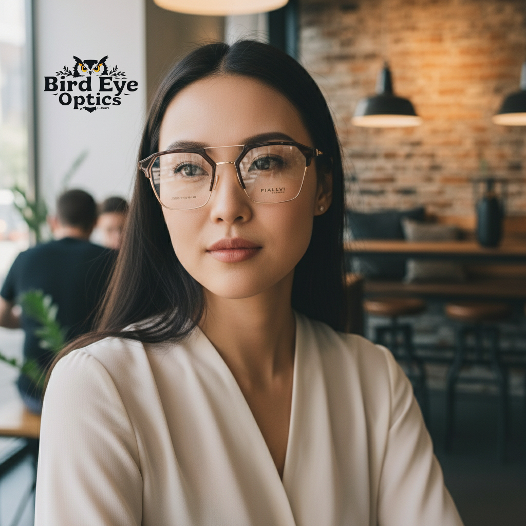 Bird Eye Optics Tip: > These frames look best on Oval, Round, and Heart-shaped faces, as the geometric angles provide a great contrast to softer facial features.