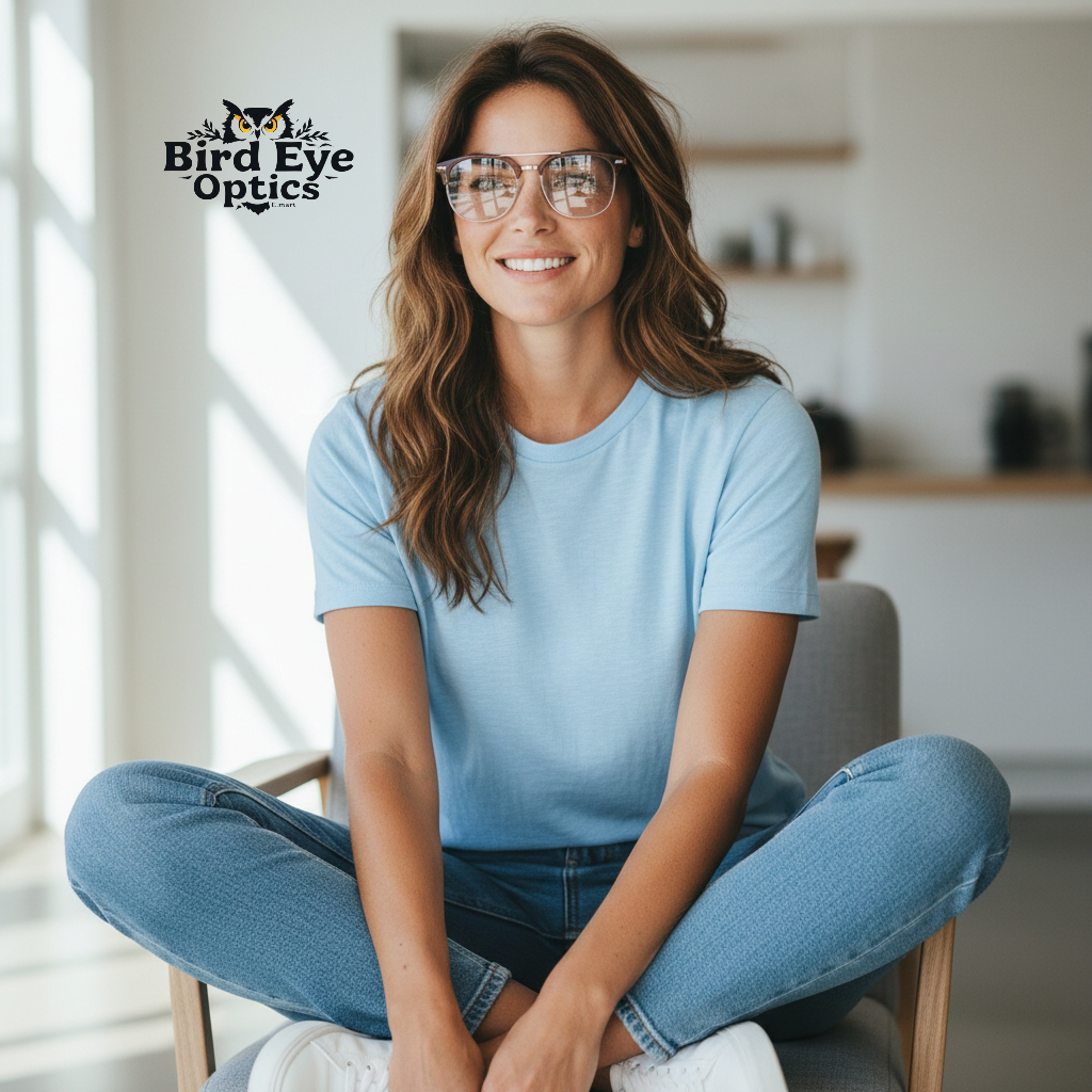 Bird Eye Optics Tip: > These frames look best on Oval, Round, and Heart-shaped faces, as the geometric angles provide a great contrast to softer facial features.