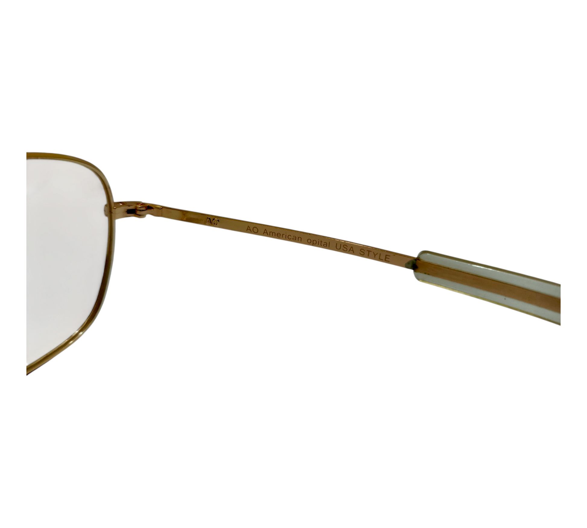 AQ American Optical USA Style" aviator glasses. Featuring a sleek gold-tone frame and a classic double bridge design, these spectacles exude vintage charm and sophisticated appeal. Perfect for adding a touch of retro flair to any outfit or for those who appreciate iconic American eyewear craftsmanship.